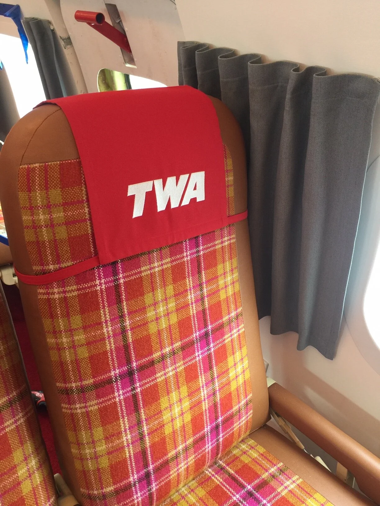 Retro-themed bar inside a 1958 Lockheed Constellation parked in front of the TWA Hotel. Vintage-inspired draperies, embroidered headrest covers, and seat-back pockets designed and constructed by Aaron Sciandra.